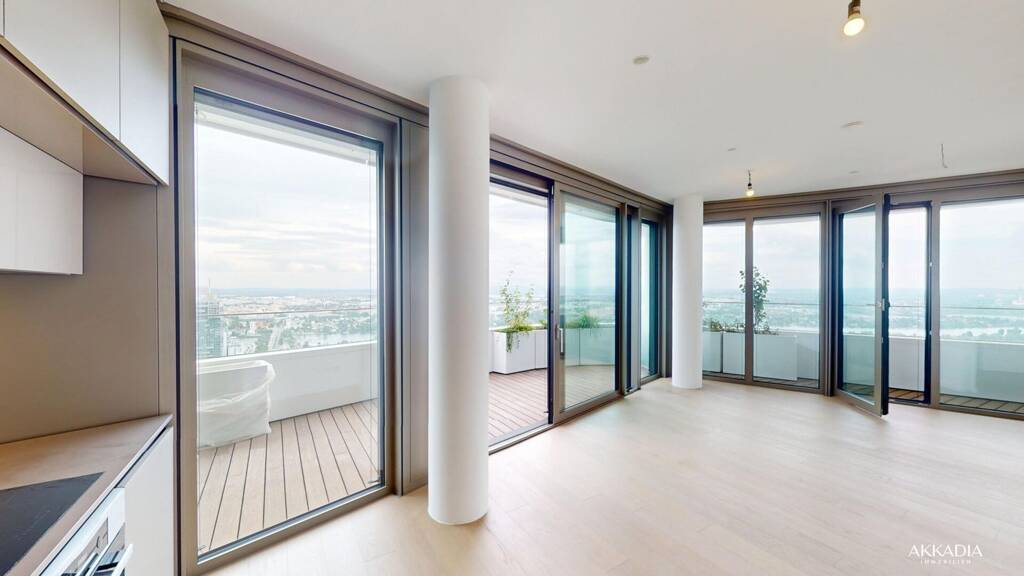 Diese moderne, smarte Wohnung befindet sich im 44. Liftstock eines der beeindruckendsten Wohnhochhäuser Wiens und bietet einen atemberaubenden Panoramablick über die Stadt. Auf ca. 49?m² Wohnfläche erwartet Sie ein durchdacht gestalteter Grundriss mit hochwertiger Ausstattung. Über ein lichtdurchflutetes Vorzimmer gelangen Sie in die offene Wohn-Küche mit moderner Einbauküche und Zugang zu einem ca. 14?m² großen Balkon, der einen beeindruckenden Fernblick eröffnet. Ein Schlafzimmer mit zusätzlichem Balkonzugang, ein stilvolles Badezimmer mit Dusche, eine separate Toilette sowie ein praktischer Abstellraum runden das Raumangebot ab.