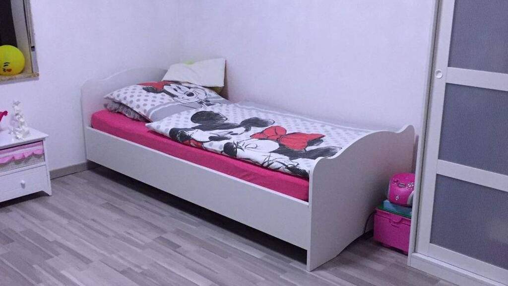 Der gesamte Schlafbereich ist mit Laminat ausgelegt .