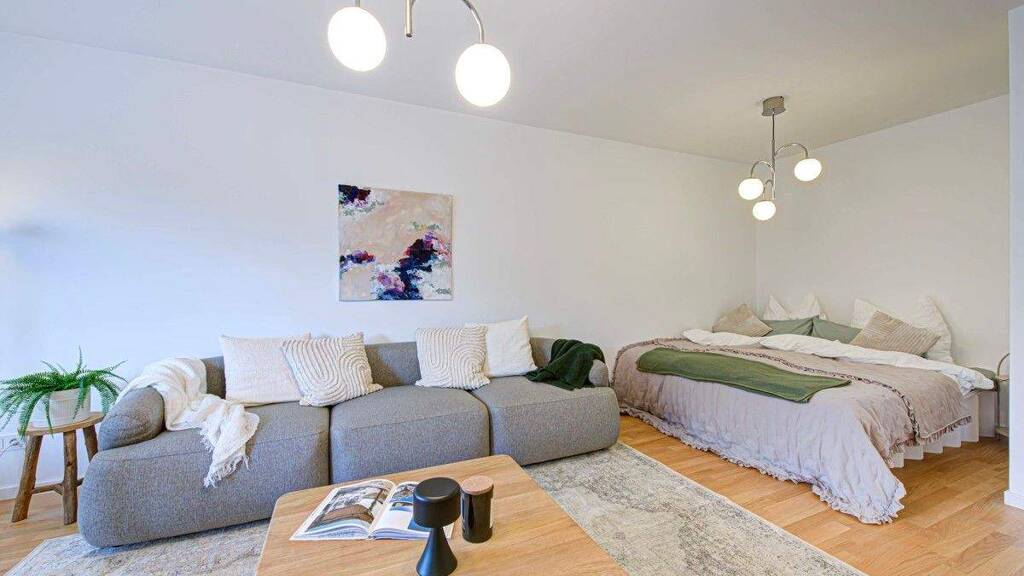 Dieses stilvoll modernisierte Studio-Apartment verbindet kompaktes Wohnen mit hochwertigem Komfort. Der großzügige Wohn-, Ess- und Schlafbereich wirkt durch die klare Raumstruktur besonders offen und einladend. Der angrenzende Balkon erweitert den Wohnraum nach draußen und bietet einen angenehmen Platz für entspannte Stunden an der frischen Luft.