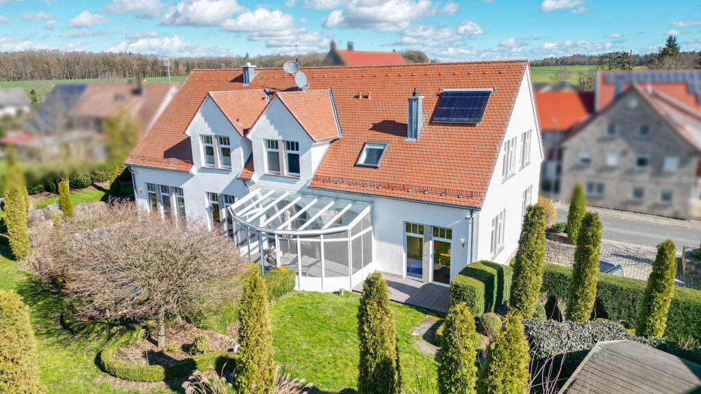 Wir freuen uns, Ihnen dieses prächtige Anwesen anbieten zu dürfen! Es handelt sich um ein 1998 in massiver Bauweise errichtetes Wohnhaus auf einem ca. 1.494 m² großem Grundstück. Dieses großzügige und gepflegte Objekt weiß mit toller Ausstattung und seinem nahezu makellosen Zustand zu beeindrucken. Hier muss nirgends Hand angelegt werden. Veränderungen sind reine Geschmackssache. Highlights im Erdgeschoss gib es gleich mehrere: das opulente, große Wohnzimmer, ein separates Esszimmer, Küche mit Speis und Hauswirtschaftsraum, bis hin zum offenen Wintergarten (Florida-Room) mit Zugang zum herrlich angelegten Garten mit Naturteich und Freisitz. Ins Obergeschoss gelangt man über eine der beiden symmetrisch zueinander verlaufenden Treppen mit Marmorstufen. Oben erwarten Sie drei Kinderzimmer und das Hauptschlafzimmer mit Ankleide, Sauna und Bad en Suite. Das Haupthaus verfügt über zwei Innenliegende Garagen und wird vom großzügigen Hof vom 2011 erbauten Nebenhaus getrennt. Dieses beherbergt im Erdgeschoss vier weitere Garagenplätze, und das Obergeschoss ist zu einer gemütlichen Ferien- Gäste- oder Teenagerwohnung ausgebaut. Der Wohnbereich beinhaltet zwei Schlafzimmer, den großen Wohnbereich, eine Pantry-Küche und ein Badezimmer und hat ca. 78,5 m². Ebenfalls auf dem Grundstück steht eine vermietete Scheune, deren Tore vom Haus abgewandt sind und welche bei Bedarf auch selbst genutzt werden kann. Aber mal ehrlich, haben wir so nicht schon Platz genug? Diese traumhaft schöne und äußerst gepflegte Immobilienkonstellation ist aber sofort verfügbar und freut sich über einen neuen Eigentümer, der sich an diesem tollen Objekt und seiner ruhigen Lage erfreut. Sie fühlen sich angesprochen? Kontaktieren Sie uns noch heute!
