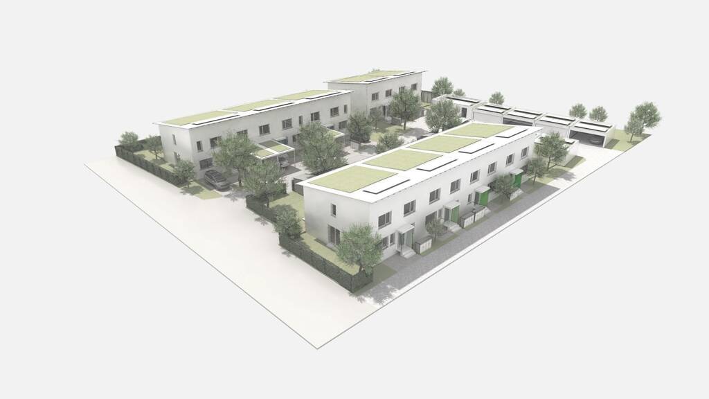 Auf dem Quartiersgrundstück im Neubaugebiet Birkenweg Süd im Ortsteil Inhauser Moos entstehen auf einer Gesamtfläche von ca. 3.618 m² eine Wohnbebauung mit einem Vierspänner, einem Dreispänner, einer Doppelhausbebauung und einem Garagenhof. Die Wohnhäuser bestehen aus einem Erd- und einem Obergeschoss und werden in Holzständerbauweise mit Massivholzdecken und betonierten Kommunwänden sowie extensiver Dachbegrünung errichtet und sind mit Photovoltaikanlagen zur Eigenstromversorgung ausgestattet. Als Dämmstoffe werden ökologisch hochwertige Materialien verwendet.