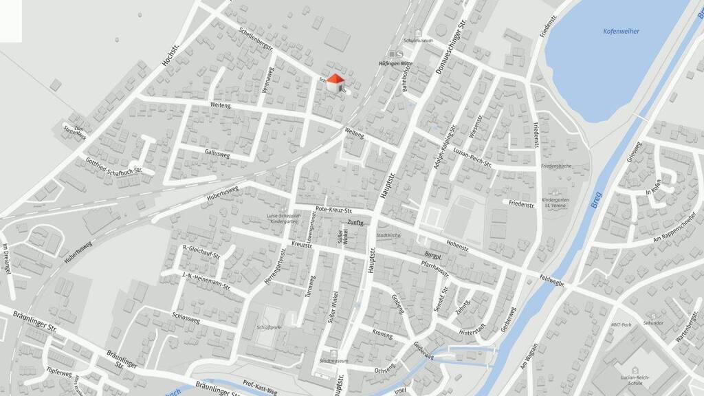 Die Doppelhaushälfte ist eines der letzten Gebäude in einer Sackgasse, wodurch der Bereich ruhig ist und keinen Durchgangsverkehr aufweist. Vom Grundstück aus ist der Blick auf den Kirchturm und die im Hintergrund liegende Hügellandschaft möglich. Gleichzeitig liegt das Haus in zentraler Lage, wobei Hüfingen als kleiner Ort alles für den täglichen Bedarf bereithält. Es gibt einen Aldi, eine Bäckerei, eine Apotheke und weitere Supermärkte im Nachbarort Donaueschingen. Nahe gelegen sind drei Kindergärten, ein Spielplatz und eine Gemeinschaftsschule. Eine Bushaltestelle ist etwa 200 Meter, der nächste Bahnhof etwa 400 Meter entfernt. Auch gibt es einen Facharzt und eine Zahnarztpraxis nur wenige Straßen weiter.