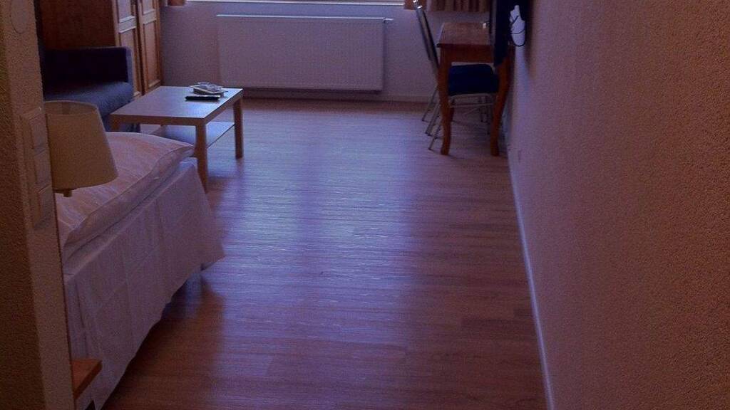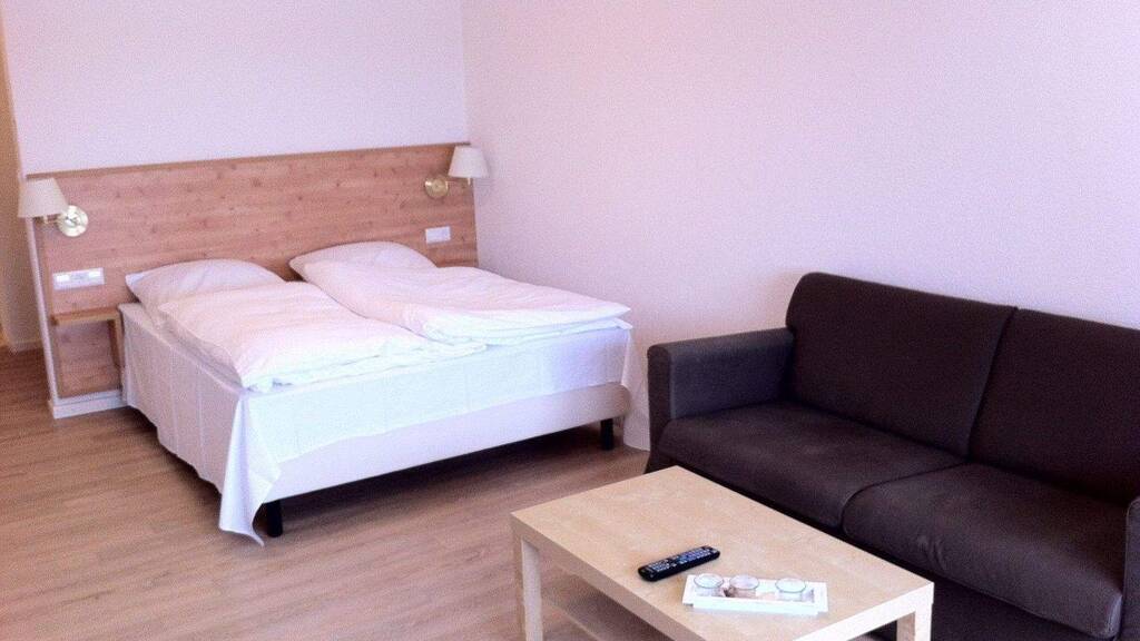 * Wohn/Schlafbereich: - TV- Flachbildschirm - ein Kleiderschrank - ein Bett (160x200 cm) mit Bettzeug und Bezug - Schreibtisch mit Stuhl - Sofa mit kleinem Tisch
