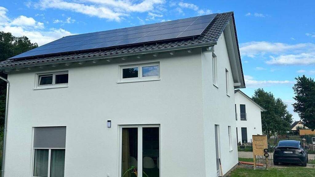Mit der PV Anlage kann der gesamte Hausstrom und der Strom f0r das Elektroauto hergestellt werden. Dei Eigentümer fahren ca, 20000 km im Jahr. Der Überschuss an Strom wird eingespeist ins Stromnetz.