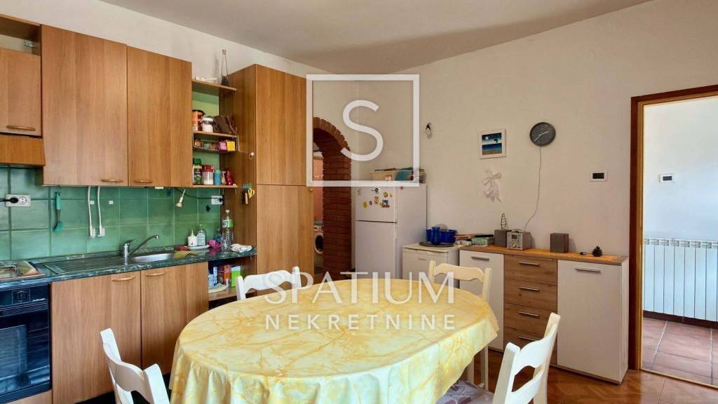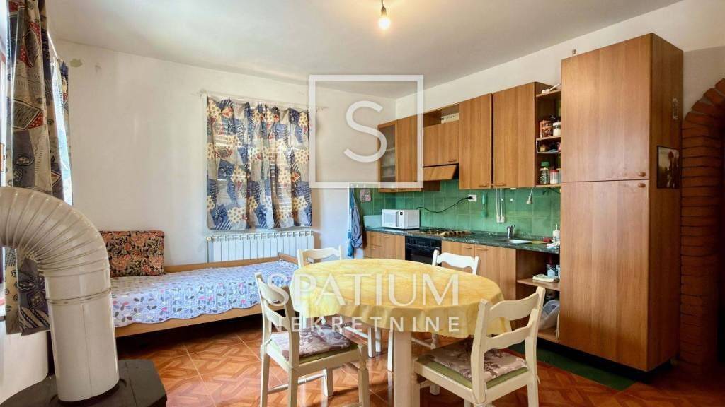 POBRI bietet eine geräumige Erdgeschosswohnung mit Terrasse in einem kleinen Wohnhaus. Die Wohnung verfügt über einen regulären Grundriss mit gleich großen Schlafzimmern. Zwei Schlafzimmer mit je 17 m² bieten viel Platz für große Kleiderschränke und Betten. Die Deckenhöhe von 2,74 m trägt zusätzlich zum Wohnkomfort bei. Am Ende des Eingangsbereichs befindet sich ein Badezimmer, angrenzend an ein Wohnzimmer mit Zugang zur Küche und zum Essbereich. Die Wohnung verfügt über eine eigene, teilweise überdachte Terrasse, ideal zum geselligen Beisammensein mit Familie und Freunden. Die Küche ist mit einem Holzofen ausgestattet, und die vorhandenen Heizkörper können je nach Bedarf und Wahl eines neuen Heizsystems wieder in Betrieb genommen werden. Die Wohnung ist bezugsfertig und eine ausgezeichnete Wahl für alle, die eine Unterkunft für einen Kurzurlaub in der Nähe von Opatija suchen, das nur wenige Autominuten entfernt liegt.