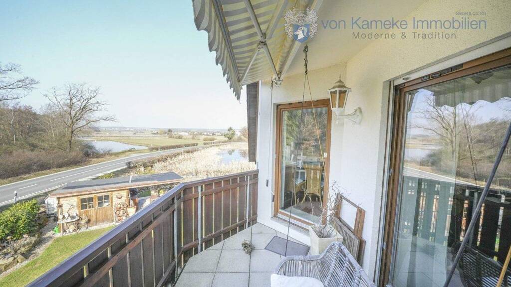Die Wohnung erstreckt sich über Ober- und Dachgeschoss. Im Obergeschoss befinden sich der helle Wohn- und Essbereich mit Kaminofen und Zugang zum Balkon mit Blick ins Grüne, die Küche im Landhausstil (verbleibt in der Wohnung), eine Speisekammer, ein Zimmer sowie ein Badezimmer mit Badewanne, Dusche, WC und zwei Waschbecken.