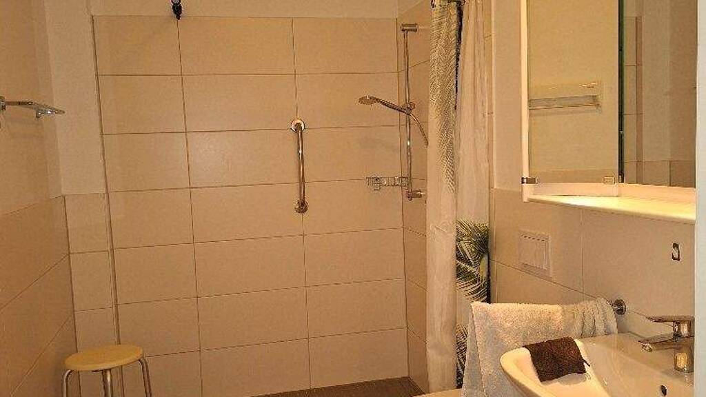 - Bäder mit bodengleichen Duschen zum bequemen Begehen, mit Schwallkante und Vorhangvorrichtung.