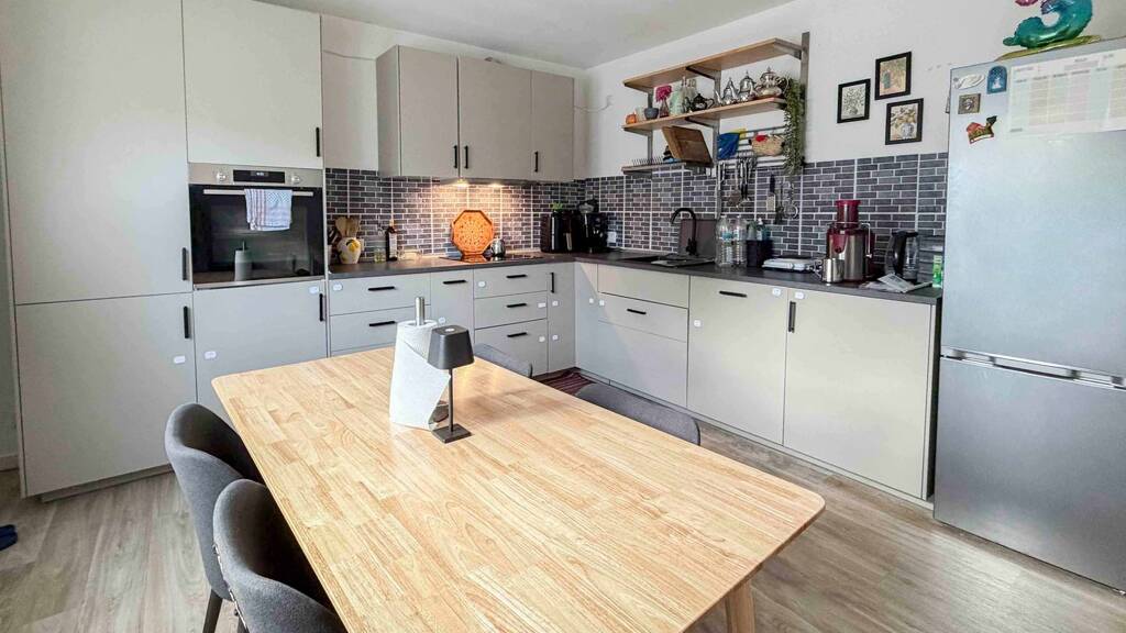 Direkt angrenzend befindet sich die moderne Einbauküche, die bereits im Kaufpreis enthalten ist. Sie überzeugt durch ihre klare Gestaltung und Funktionalität und bildet einen natürlichen Treffpunkt im Alltag - vom gemeinsamen Kochen bis hin zum entspannten Beisammensein.