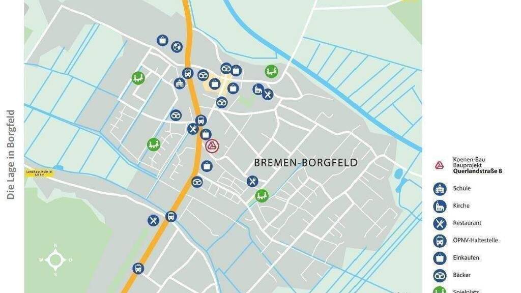 Der Bremer Stadtteil Borgfeld erfreut sich seit jeher großer Beliebtheit. Die Dinge des täglichen Bedarfs und diverse Einkaufsmöglichkeiten sind fußläufig oder in wenigen Fahrminuten erreichbar. Durch die sehr gute Anbindung an den ÖPNV - Haltestelle der Straßenbahn 4 in unmittelbarer Nähe - erreicht man die Bremer Innenstadt in etwa 25 Minuten und auch der schnelle Weg zum Autobahnzubringer sorgt für zügige Verbindungen. Darüber hinaus bietet das nahe gelegene Naturschutzgebiet "Borgfelder Wümmewiesen" viele gute Möglichkeiten für Aktivität und Erholung und dies trägt somit ebenso zu einer hohen Lebensqualität in diesem Stadtteil bei.