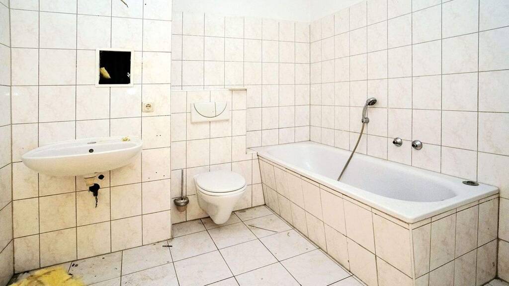 Im Erdgeschoss links ist eine Gewerbeeinheit angeordnet, die zuletzt als Imbiss genutzt wurde. Des Weiteren verfügt das Objekt jeweils über 2-Zimmerwohnungen zwischen 46 m² und 50 m². Im DG wurden zwei Wohnungen zu einer großzügigen Einheit mit einer Wohnfläche von ca. 96 m² zusammengelegt. Eventuell besteht die Möglichkeit, den Dachboden zu einer Wohnung auszubauen. Die Ausbaumöglichkeit wurde vom Auktionshaus nicht geprüft. Die Wohneinheiten sind stark abgewohnt, das Flachdach des Seitenflügels ist undicht, Nässeschäden im Wand- und Deckenbereich sind erkennbar. Des Weiteren weisen die Keller Feuchteschäden auf, partiell auch die Wohneinheit im EG. Schimmelbildung teilweise erkennbar, Vandalismusschäden sowie Müllablagerungen sind vorhanden. Vor dem Objekt stehen 4 Stellplätze zur Verfügung. Es besteht umfassender Sanierungs-, Instandsetzungs- und Modernisierungsbedarf.