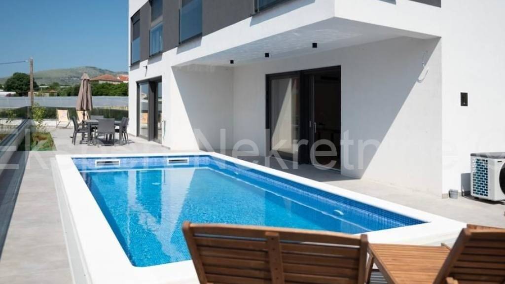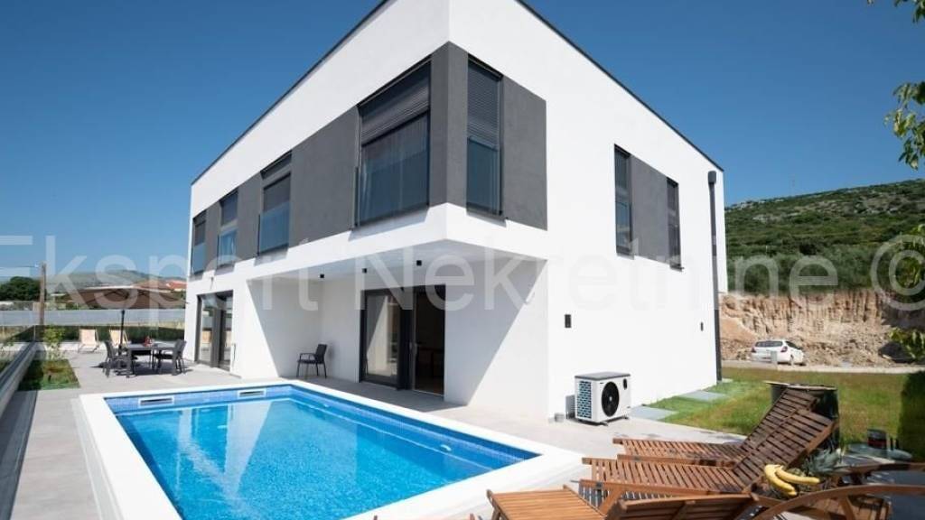 Trogir, eine Luxusvilla von 340 m2 mit Pool in einem neuen Gebäude in ruhiger Lage mit wunderschönem Blick auf das Meer. Die Villa befindet sich auf einem Grundstück von 510 m2. Im Keller befindet sich eine Doppelgarage mit Platz für eine Sauna, ein Whirlpool und ein Raum für geselliges Beisammensein und eine Toilette. Im Erdgeschoss gibt es ein Badezimmer, einen Flur, eine Innentreppe und eine große Küche mit Esszimmer und ein großes Wohnzimmer sowie eine große Außenterrasse mit Schwimmbad. Im ersten Stock gibt es 4 Schlafzimmer mit zwei Badezimmern. Das ganze Haus verfügt über Fußbodenheizung und Kanalklimaanlage an der Decke. Die Villa wurde fertiggestellt, hochwertige Materialien wurden installiert (hochwertige Keramik, PVC-Tischlerei, Moskitonetze, Heizung und Kühlung, komplett neue Möbel usw.) und es ist bezugsfertig. Friedliche und ruhige Lage abseits des Stadttrubels und dennoch nah genug an allen Inhalten in nur wenigen hundert Metern Entfernung. Eigentumsverhältnisse und andere Unterlagen sind in Ordnung. Für weitere Informationen wenden Sie sich bitte an die Agentur..