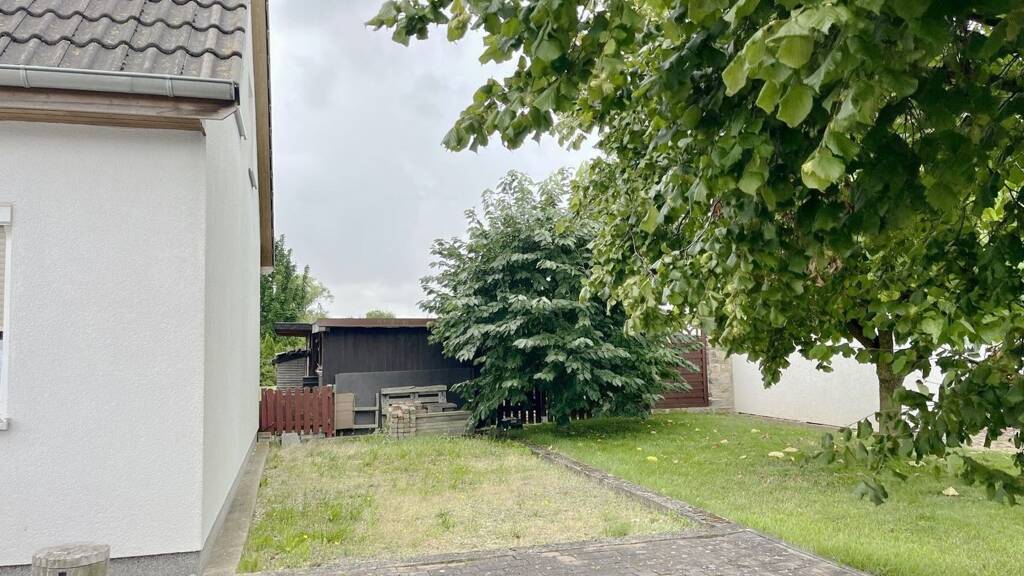 Der Garten ist pflegeleicht angelegt und verfügt über einen praktischen Geräteschuppen. Vor dem Haus stehen Parkmöglichkeiten bereit und auf der rechte Hausseite gibt es Platz für eine Garage oder Carport.