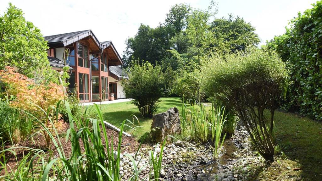 Genießen Sie die Natur auf den zwei überdachten Balkonen oder erkunden Sie das Parkgrundstück in Südwest-Ausrichtung mit eigenem Obst- und Gemüsegarten. Ein idyllischer Weiher mit Badesteg und Springbrunnen lädt zum Verweilen ein.
