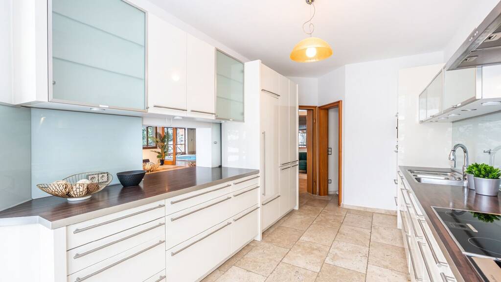 Der Wohnbereich besticht durch hohe Decken und eine offene Galerie, die dem Raum ein beeindruckendes Gefühl von Weite verleihen. Ein gemauerter Kamin sorgt für behagliche Atmosphäre und rundet das luxuriöse Ambiente ab. Die Designer-Einbauküche mit Durchreiche zum Wohnzimmer ist nicht nur ein kulinarisches Highlight, sondern auch ein geselliger Treffpunkt für die ganze Familie.