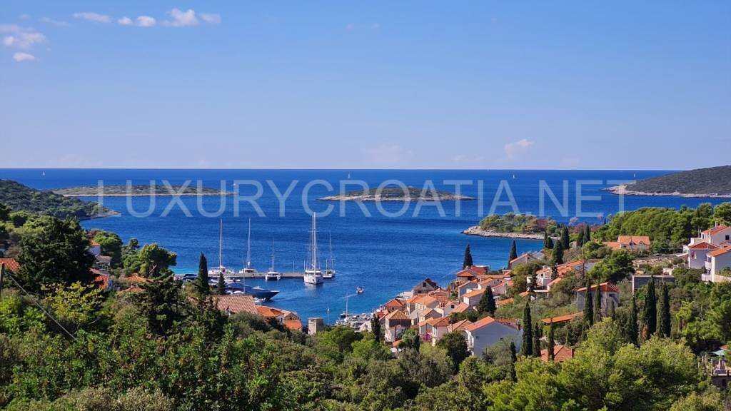 Baugrundstück mit Meerblick zum Verkauf Die kroatische Insel Solta befindet sich auf der Hügelseite mit Blick nach Westen und bietet einen atemberaubenden Panoramablick auf das Meer. Von der Terrasse der großen Villa mit Pool, die Sie hier bauen können, können Sie spektakuläre Sonnenuntergänge über dem Meer und den kleinen Inseln vor dem Dorf Maslinica genießen.