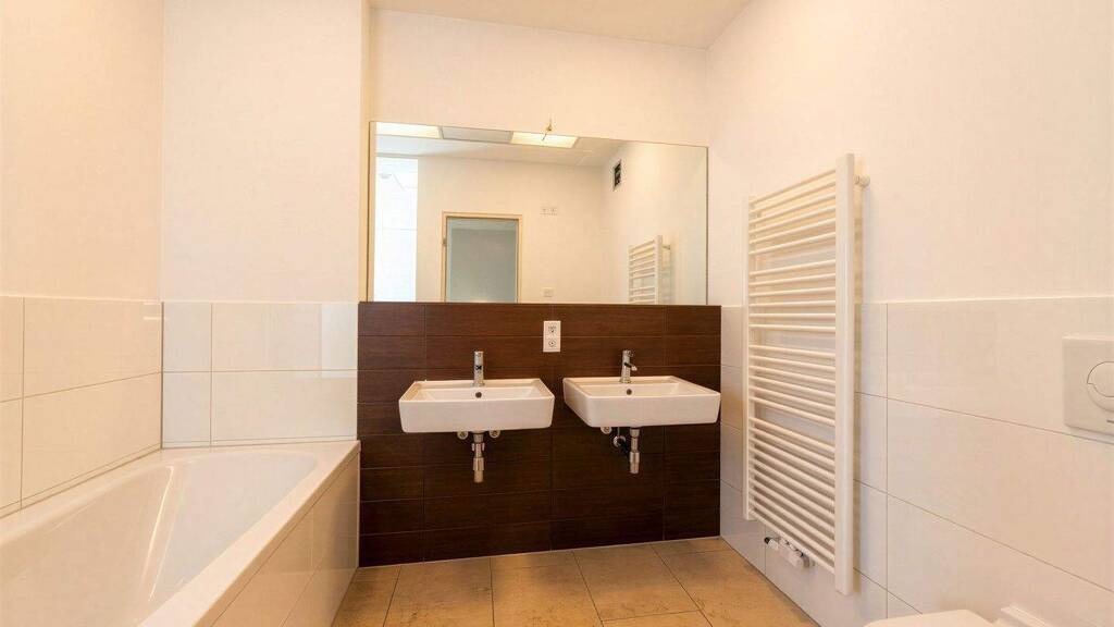 Über eine innenliegende Treppe gelangt man in das 2. Obergeschoss, das den Lebensmittelpunkt der Wohnung bildet. Hier erwartet Sie ein weiteres Schlafzimmer mit angrenzender Ankleide, ein großzügiges Badezimmer mit zwei Waschtischen und Badewanne sowie ein offener, lichtdurchfluteter Wohn- und Essbereich. Die großzügige Raumwirkung wird insbesondere durch zwei große Schiebefenster zur Loggia unterstrichen, die für viel Tageslicht sorgen und einen angenehmen Übergang zwischen Innen- und Außenbereich schaffen. Eine Küche ist derzeit nicht vorhanden, sodass zukünftige Eigentümer ihre individuellen Vorstellungen optimal umsetzen können.