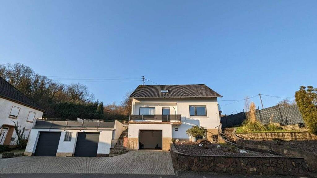 Kirf-Meurich - 10 Minuten bis Schengen oder Remich Einfamilienhaus mit Aufzug und tollem Außenbereich - +- 160 m² Wohnfläche - +- 860 m² Grundfläche - 4 Schlafzimmer - Offener Wohn und Essbereich - Aufzug vorhanden -3 Garagen und 3 Stellplätze - Ruhige Lage mit wunderschöner Fernsicht - 2 Balkon - schöner Garten mit viel Potential