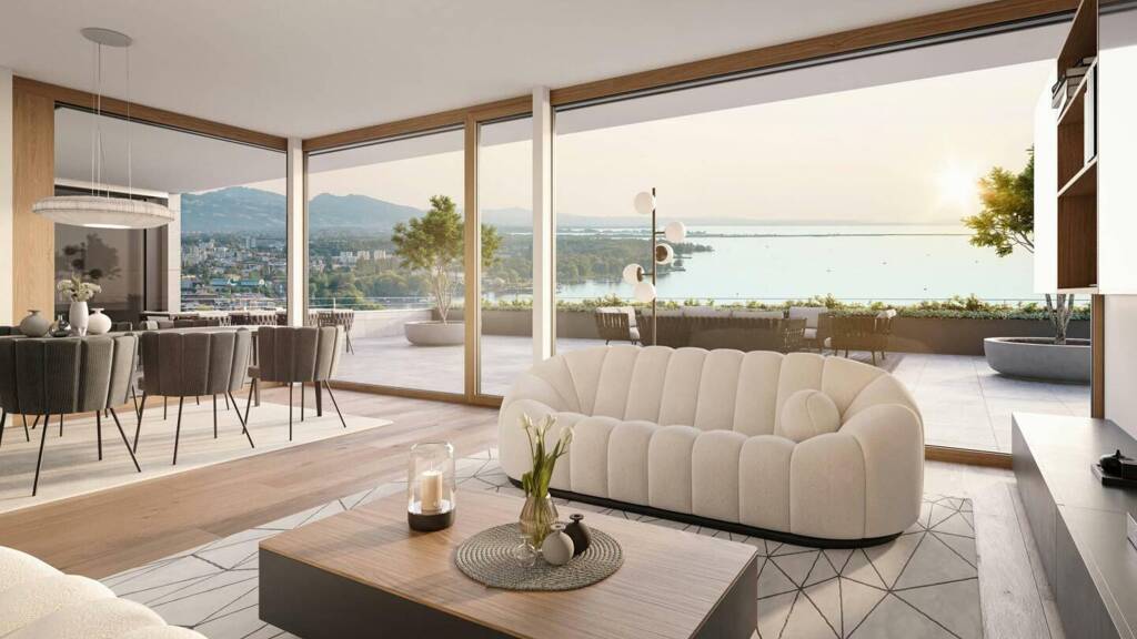 Die luxuriöse Wohnung erstreckt sich über eine großzügige Gesamtnutzfläche von ca. 394 m² und beeindruckt durch eine offene und moderne Raumaufteilung. Beim Betreten des Objekts gelangt man zunächst in ein elegantes Foyer, das den hohen Standard der Wohnung widerspiegelt. Direkt angrenzend befindet sich ein praktischer Abstellraum, der zusätzlichen Stauraum bietet. Ein separates Gäste-WC sorgt für Komfort und Privatsphäre. Der weitläufige Wohn-, Ess- und Kochbereich mit ca. 90 m² bildet das Herzstück der Wohnung. Die moderne Küche geht nahtlos in den Essbereich über, der sich ideal für gesellige Abende eignet. Von hier aus hat man direkten Zugang zur Panoramaterrasse, die mit etwa 101 m² eine spektakuläre Aussicht auf den Bodensee bietet. Zusätzlich zu diesen zentralen Räumen gibt es eine praktische Speisekammer sowie eine stilvolle Weinbar, die den Wohnbereich perfekt ergänzt und zusätzlichen Luxus und Funktionalität bietet. Ein Büro, das sich ideal für das Arbeiten von zu Hause eignet, sowie ein (Gäste) Zimmer mit Badezimmer sorgen für reichlich Platz. Über die Ankleide, die ausreichend Raum für eine umfangreiche Garderobe bietet, erreichen Sie das Master-Bedroom mit Mast-Bathroom. Ein wahres Refugium. Die Wohnung vereint urbanes Leben und Natur in perfekter Weise: Die grüne Umgebung sorgt für eine ruhige und idyllische Atmosphäre, während die Lage Ihnen gleichzeitig schnellen Zugang zu allen Annehmlichkeiten der Stadt bietet. Eine Tiefgarage stellt sicher, dass Ihr Fahrzeug sicher und bequem untergebracht ist.