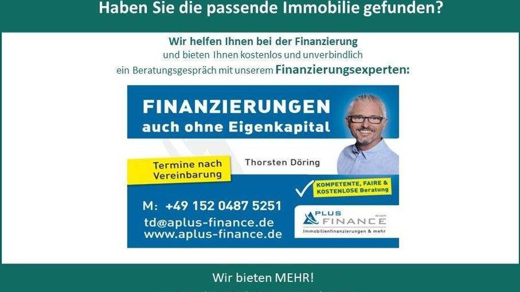 Sie möchten diese Immobilie finanzieren? Vereinbaren Sie mit uns einen Beratungstermin, natürlich kostenfrei und unverbindlich. Aus einem Pool von 100 Banken finden wir, auch für Sie, die passende Finanzierung!