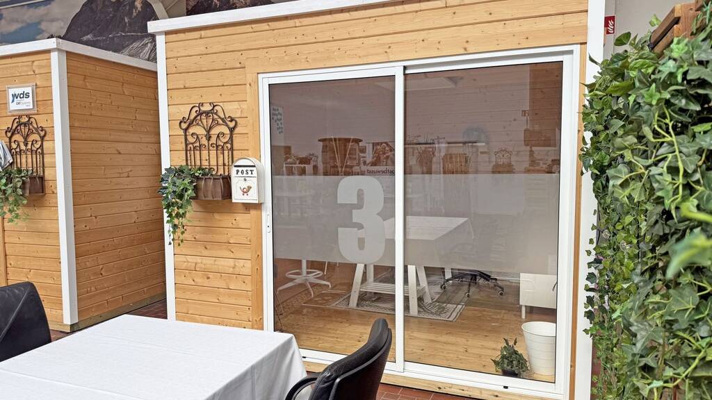 Abschließbares, eigenes Büro mit Schreibtisch, Stühlen, Whiteboard (magnetisch), Steckdosen, Teppichboden, Deckenbeleuchtung und Klimaanlage.