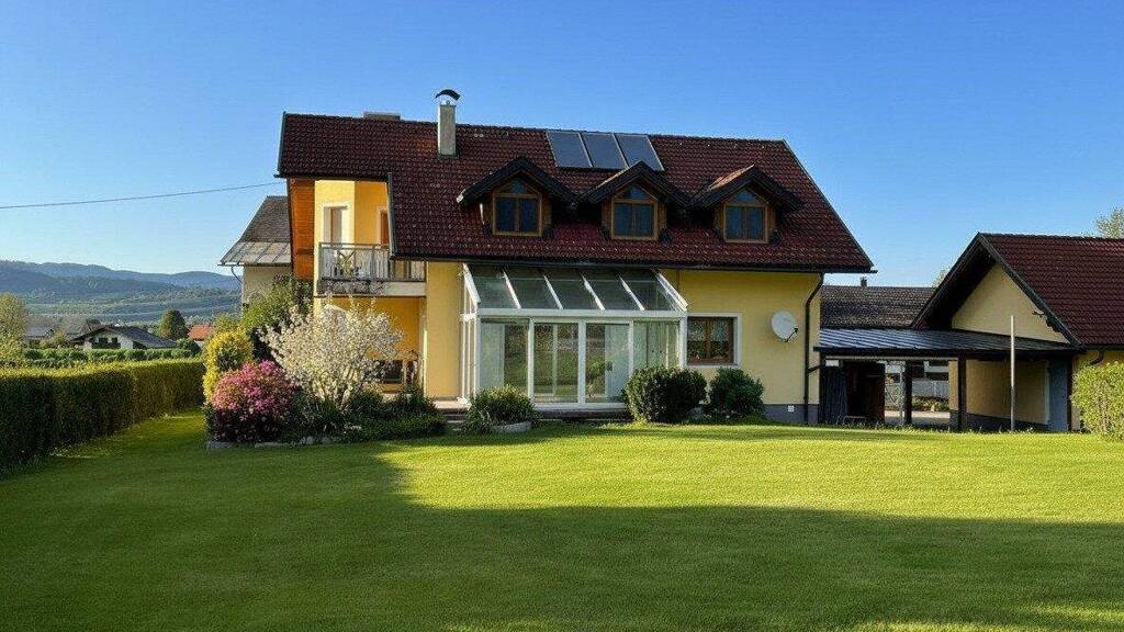 Gepflegtes Landhaus mit viel Platz in traumhafter Panoramalage! Rund um das Haus befindet sich ein weitläufiger Garten mit herrlicher Aussicht auf die Karawanken und genügend Platz für einen POOL oder SCHWIMMTEICH. Das Haus ist nach Süden ausgerichtet und verwöhnt mit Sonne im Wintergarten, als auch auf der Süd-West Terrasse. Ein wunderbarer Sitzplatz mit altem Baumbestand, stillgelegtem Koiteich mit dazugehörigem Wasserfall laden zum Entspannen ein. Ein XXL-Insektenhotel, ein Igelhaus, ein Kobel und  eine Futterstation für Eichhörnchen locken auch zahlreiche Besucher aus der Natur an. Ein Garten wo sich jeder wohl fühlt. Weitere Highlights sind eine Kräuterspirale und ein ergonomisches, massives Hochbeet.