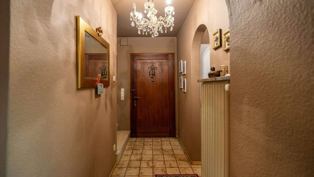 Ein zentraler Flur erschließt das Erdgeschoss übersichtlich. Garderobe und Gäste-WC liegen linkerhand, die Treppe ins Obergeschoss rechterhand. Die Küche im gepflegten Retro-Stil bewahrt derzeit den Originalcharakter, bietet jedoch hervorragendes Potenzial für Durchbrüche oder Teilöffnungen, um eine moderne, offene Wohnküche zu realisieren.