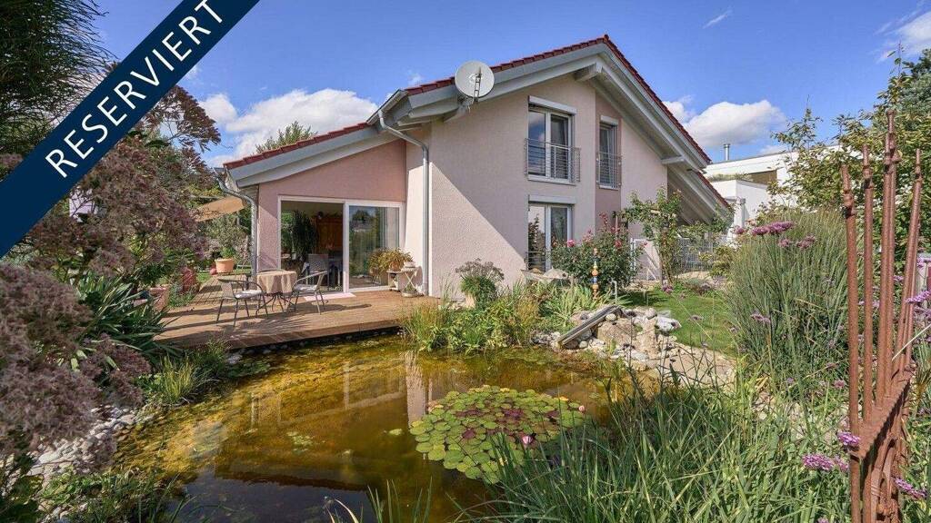 Betreten wird das Objekt über die im Carport gelegene Haustüre, welche Zugang zu einem angrenzenden Flur inklusive offenem Treppenhaus gewährt. Von diesem Flur aus lassen sich eines der Badezimmer ausgestattet mit einer bodentiefen Dusche, einem Waschtisch und einem WC, der Technikraum sowie der offen gestaltete Wohn- Essbereich mit Küche erreichen, welcher wiederum Zugang zum nach Süden ausgerichteten Wintergarten bietet, von welchem aus sich ein wundervoller Blick über den gemütlichen Teich und den wundervoll angelegten Garten bietet. Dieser ist den ganzen Tag über von der Sonne verwöhnt und beherbergt verschiedene Terrassen, Geräteschuppen und einen in den Hang gebauten terrassierten Gartenteil welcher einen schönen, erhabenen Blick über das eigene Grundstück sowie die angrenzenden Felder bietet.