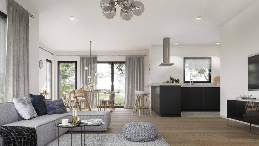 Im Erdgeschoss erwartet Sie ein geräumiges Wohnzimmer mit großen Fenstern, die viel Tageslicht hereinlassen. Die offene Küche bildet das Herz des Hauses und ist ideal für das gesellige Beisammensein. Das Esszimmer bietet Platz für gemeinsame Mahlzeiten und Feierlichkeiten.