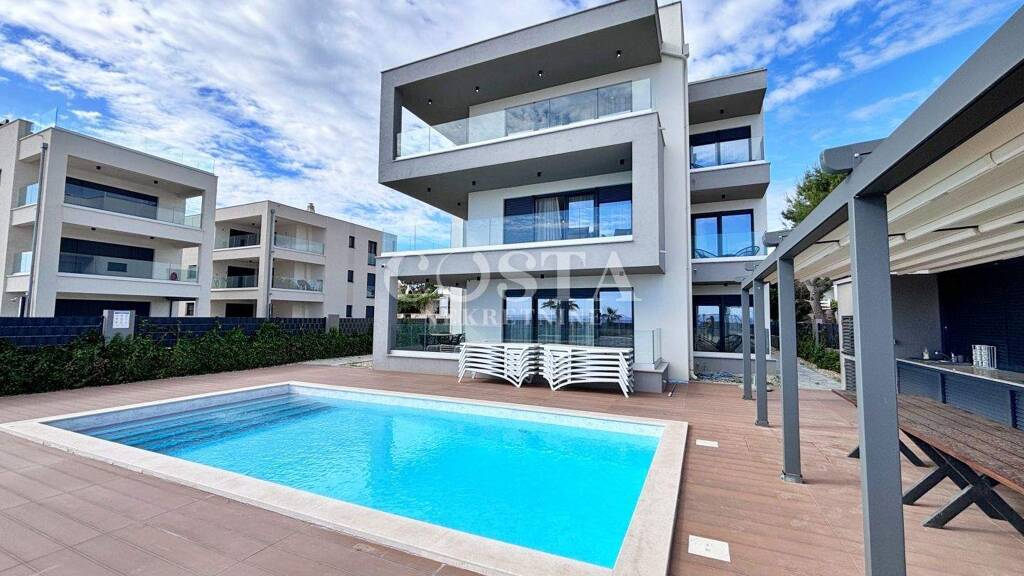 Auf der Insel Vir in der Gespanschaft Zadar steht eine luxuriöse Apartmentvilla mit Pool zum Verkauf. Das Anwesen mit einer Wohnfläche von 457 m² befindet sich auf einem 1001 m² großen Grundstück. Es besteht aus einem Erdgeschoss und zwei Obergeschossen mit vier luxuriös ausgestatteten Apartments. Jedes Apartment verfügt über ein Wohnzimmer, eine Wohnküche, zwei Schlafzimmer mit Bad, ein Gäste-WC und eine Terrasse. Im Erdgeschoss befinden sich neben einem Apartment ein Wellnessbereich mit Sauna und Fitnessgeräten, ein Spielzimmer, ein Abstellraum und eine Waschküche. Im ersten Obergeschoss befinden sich ein ein- und ein zweistöckiges Apartment, im zweiten Obergeschoss ein weiteres Apartment mit zwei Schlafzimmern. Die gesamte Nutzfläche des Anwesens inklusive Terrassen beträgt 692 m². Im großzügigen Innenhof der Villa befinden sich ein 38 m² großer Swimmingpool, eine Sommerküche, ein Kinderspielplatz, ein Garten und ein privater Parkplatz.