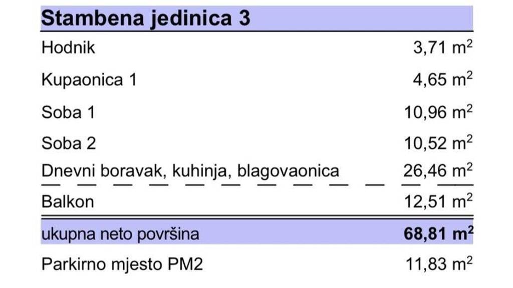 Predstavljamo Vam projekt vrhunske novogradnje u Povljani na otoku Pagu na top lokaciji! Projekt se sastoji od zgrade s 8 jedinica stambene namjene rasporedenih na ukupno 3 etaze. Zgrada je udaljena svega 180 m od mora i popularnih pjescanih plaza ovog mjesta. Takoder, u neposrednoj blizini se nalazi i centar Povljane kao i svi ostali sadrzaji potrebni za kvalitetan i ispunjen zivot ili odmor.S3 - 62,55m2 - 1. katStan S3 nalazi se na 1. katu zgrade te je ukupne neto korisne povrsine 62,55m2 dok njegova bruto povrsina iznosi 68,81m2. Sastoji se od otvorenog prostora kuhinje, blagovaonice i dnevnog boravka (26,46m2), hodnika (3,71m2), potpuno opremljene kupaonice (4,65m2), dvije spavace sobe (10,96m2 i 10,52m2) te natkrivenog balkona s kojeg se pruza prekrasan pogled na more (12,51m2). Stanu uz to pripada i jedno vanjsko parkirno mjesto.Zgrada se trenutacno nalazi u fazi zavrsnih radove te se useljenje ocekuje pocetkom 2026. godine.Od opreme i materijala valja istaknuti :Konstrukcija od armiranog betona s 10 cm termoizolacijeKvalitetna ALU i PVC stolarija s komarnicima i roletama na elektricno upravljanjeVisoka kvaliteta keramike i sanitarijaProtuprovalna i protupozarna vrataKlima uredaji u svim sobama i dnevnom boravkuStaklene ograde na balkonimaDvoriste ogradeno kamenim zidovimai jos mnogo toga..Povljana je sarmantno dalmatinsko mjesto na otoku Pagu, poznato po dugim pjescanim plazama i kristalno cistom moru. Idealan je izbor za nekretnine za odmor ili turisticki najam - autentican dalmatinski ugodaj, prostrane terase i blizina lokalnih restorana. Dobra prometna povezanost cestom te blizina vaznijih otocnih i kopnenih odredista cine Povljanu privlacnom investicijskom lokacijom na Pagu.Za vise informacija i dogovor o razgledavanju, slobodno nam se obratite... Vise na eurovilla.hr, ID: 468369