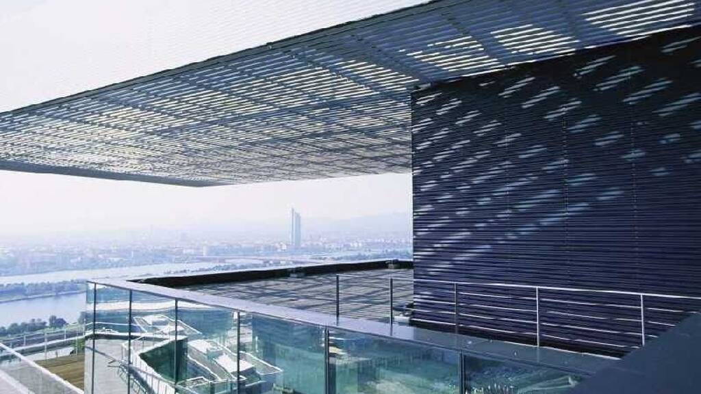 Der Baukörper wird durch ein unverkennbares Wechselspiel von Einschnitten und Erkerelementen strukturiert. Zahlreiche Terrassen und Balkone bieten einen atemberaubenden Blick auf die Stadt und den direkt angrenzenden Donaupark. Großzügige Glasflächen gestatten aber auch einzigartige Ausblicke vom Inneren des Gebäudes.