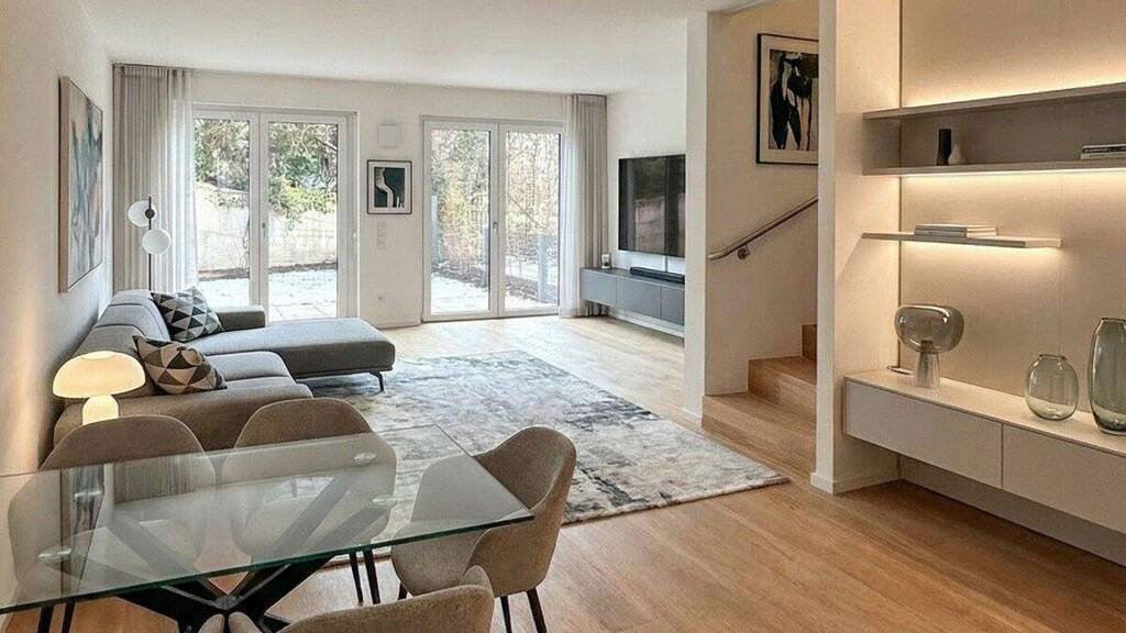- Attraktive Reihenmittelhäuser - die idealen Familiendomizile - Tolles Platzangebot mit vier ausgebauten Wohnebenen und Outdoorbereich - Großzügige 4,5 Zimmer, Wohnflächen bis zu 158 m² und bis zu 245 m² Nutzfläche - Anspruchsvolle Architektur mit moderner Fassade - z.B. aufwändige Putzstruktur, überwiegend bodentiefe Fenster in dunkler Rahmung, elegante Geländer etc. - Durchdates Raumkonzept mit offenem Wohn- / Küchen- / Essbereich, ausgebautem Dachgeschoss inkl. Bad und ausgebautem Keller inkl. Hobbyraum und teilw. Sauna - Innenarchitektur mit raffinierten Details - Überschaubares Häuserensemble - nur zwei Dreispänner - Ruhige, grüne Lage mit Süd-Ausrichtung - Nachhaltig und kostensparendes Energiekonzept mit Grundwasser-Wärmepumpe und Solarstrom - Großzügige Privatgärten - Bequemes Parken in der Tiefgarage