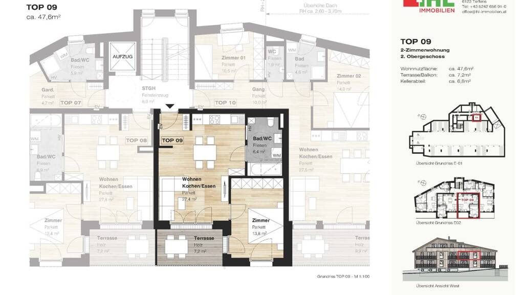 In zentraler und sonniger Lage realisierten wir in der Sennereistraße 1 in Fügen ein Wohn- und Geschäftshaus. Im Erdgeschoss entstand das Büro der Skiliftgesellschaft Hochfügen, in den Geschossen darüber die 9 Wohnungen. Die Erschließung der Liegenschaft erfolgt von der Bahnhofstraße (Haupteingang) und der Sennereistraße aus. Der Innenausbau der Wohnungen wird nach dem Verkauf individuell angepasst, sodass die Käuferin / der Käufer noch mitplanen kann - die Wohnung wird innerhalb weniger Wochen bezugsfertig sein.