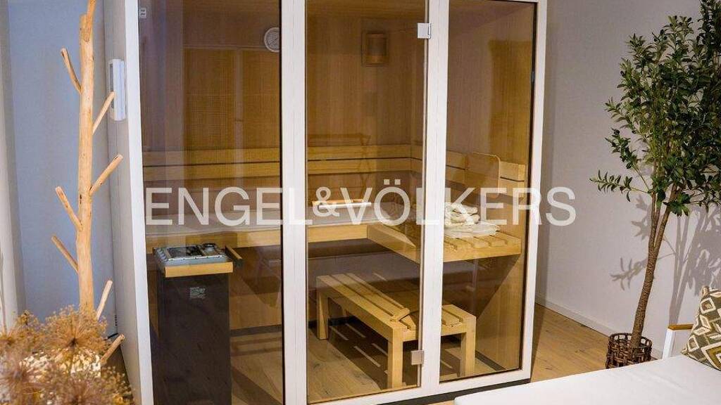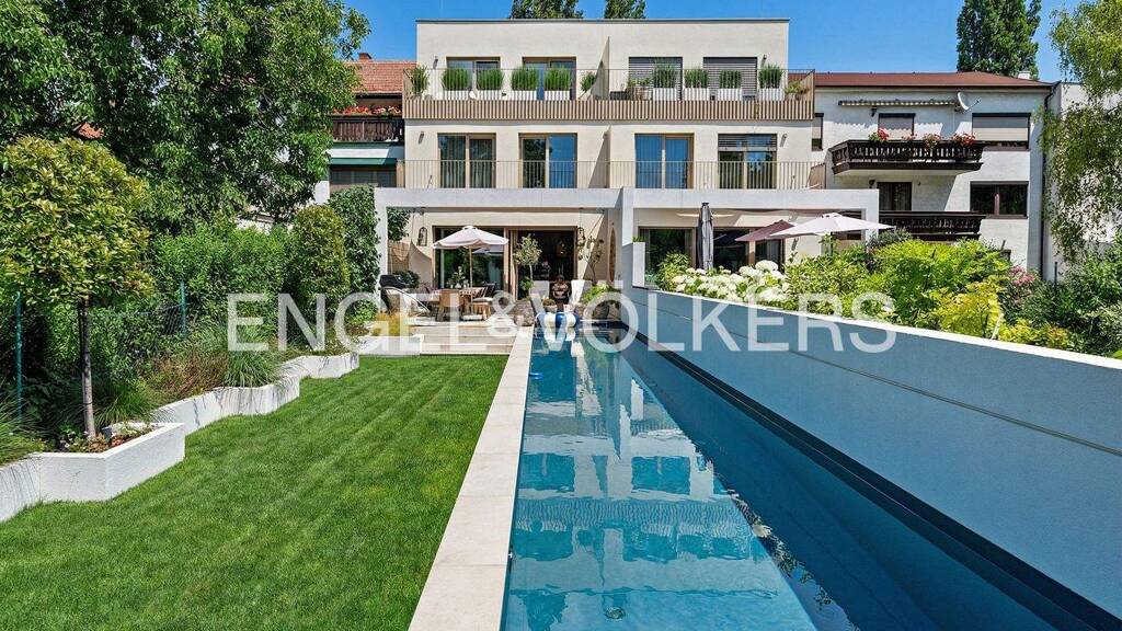 Diese außergewöhnliche Doppelhaushälfte vereint moderne Architektur, hochwertigste Ausstattung und ein exklusives Wohngefühl auf drei Ebenen. Hier erwartet Sie ein Zuhause, das Design, Komfort und Lebensqualität auf höchstem Niveau verbindet. Über den einladenden Eingangsbereich gelangt man in das lichtdurchflutete Gartengeschoss mit einer Raumhöhe von drei Meter und einem offenen, lichtdurchfluteten Wohnkonzept. Die stilvolle Designküche mit großzügiger Kochinsel, hochwertigen Gaggenau-Geräten und Quooker-Wasserhahn geht fließend in den Ess- und Wohnbereich über und bildet das Herzstück des Hauses. Großflächige Fensterfronten öffnen den Raum zur Terrasse und in den Garten und schaffen eine elegante Verbindung zwischen Innen- und Außenbereich. Ein clever integrierter Speise- und Abstellraum ist dezent hinter einer Küchenfront verborgen und sorgt für zusätzlichen Stauraum. Im Obergeschoss stehen zwei flexibel nutzbare Zimmer zur Verfügung - perfekt als Kinderzimmer, Homeoffice oder Ankleide - sowie ein modernes Badezimmer mit Dusche. Der Masterbereich im obersten Geschoss bietet ein Schlafzimmer mit en-suite-Bad inklusive freistehender Badewanne, Dusche und Klimaanlage - ein privater Rückzugsort mit Hotelcharakter. Im Untergeschoss befindet sich der private Wellnessbereich mit Sauna sowie der Hauswirtschafts- und Technikraum. Der Außenbereich überzeugt durch klare Gestaltung und hochwertige Ausführung. Das Highlight bildet der rund 16 Meter lange beheizte Pool, der an warmen Tagen zum Schwimmen und Entspannen einlädt. Die Terrasse und der pflegeleichte Garten schaffen zusätzlichen Freiraum für Ruhe und Erholung. Außerdem bieten das Poolhaus und die großzügige Garage, mit E-Ladestation, zusätzlichen Stauraum für Fahrzeuge, Gartengeräte, o.ä.