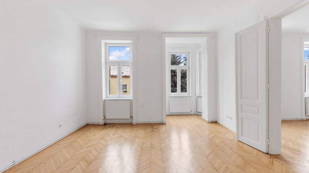 Die Wohnung liegt im 1. Stockwerk (zzgl Hochparterre) eines gut erhaltenen Zinshauses und teilt sich wie folgt auf: