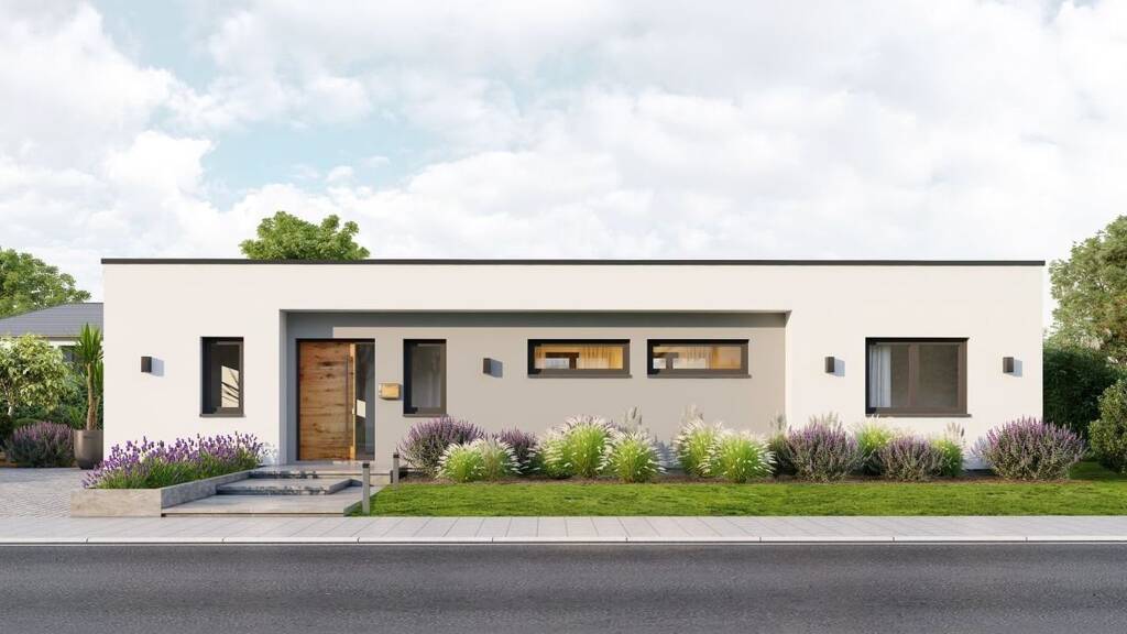 Hier trifft gehobener Komfort auf ein ebenerdiges Wohnkonzept, das auch im Alter noch in vollen Zügen genossen werden kann. Auf stolzen 160 m² Wohnfläche beweist unser Bungalow 5, dass das Wohnen auf einer Ebene keinesfalls nur etwas für Senioren ist! So begeistert das Einfamilienhaus etwa durch sein modernes Flachdach und seine durchdachte Raumaufteilung, bei der jeder Quadratmeter sinnvoll genutzt werden kann und viel Platz für das gemeinsame Familienleben bietet. Neben zwei Kinderzimmern mit eigenem Dusch-WC und einem Eltern-Bereich mit modernem Badezimmer verfügt der Bungalow nämlich auch über ein eigenes Arbeitszimmer sowie ein Gäste-WC im Eingangsbereich des Hauses. Die Technik kommt im Hauswirtschaftsraum unter, während sowohl aus dem Ess- als auch aus dem Wohn-Bereich der direkte Zugang zur Terrasse möglich ist. Bodentiefe Fensterflächen erfüllen die Räume dabei mit hellem Tageslicht und steigern den Wohnkomfort zusätzlich.
