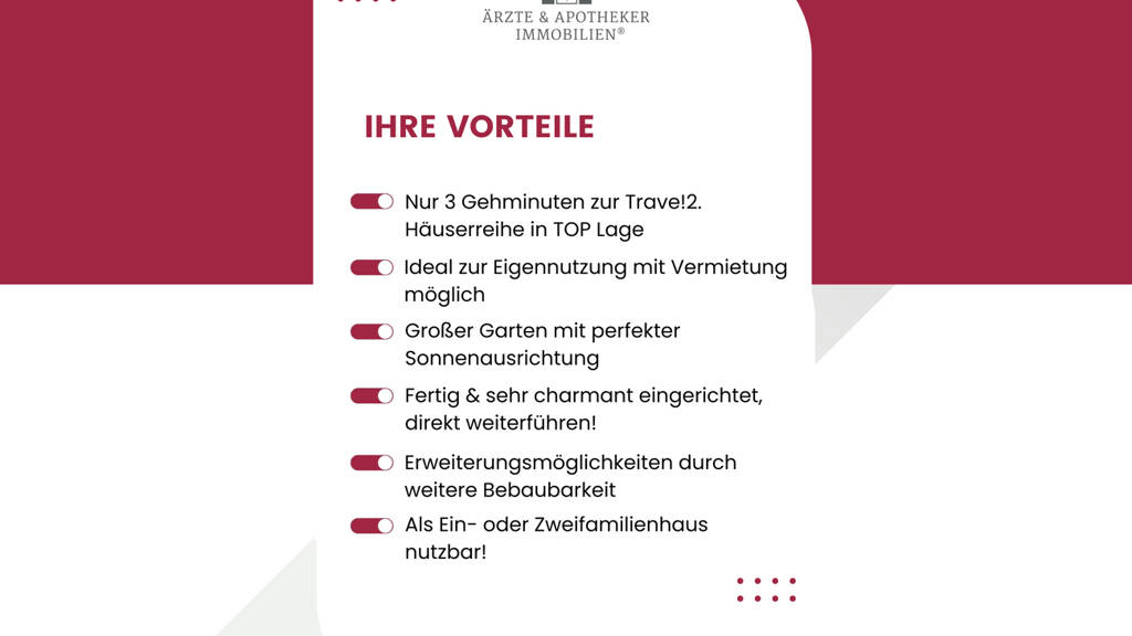 Entdecken Sie dieses außergewöhnliche Ensemble aus drei separaten Ferienhäusern in einer der begehrtesten Lagen von Travemünde!