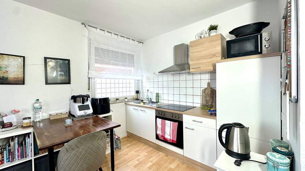 Das Badezimmer verfügt über eine Badewanne und ist mit modernen Fliesen ausgestattet. Gere kann die Küche der Vormieterin übernommen werden.