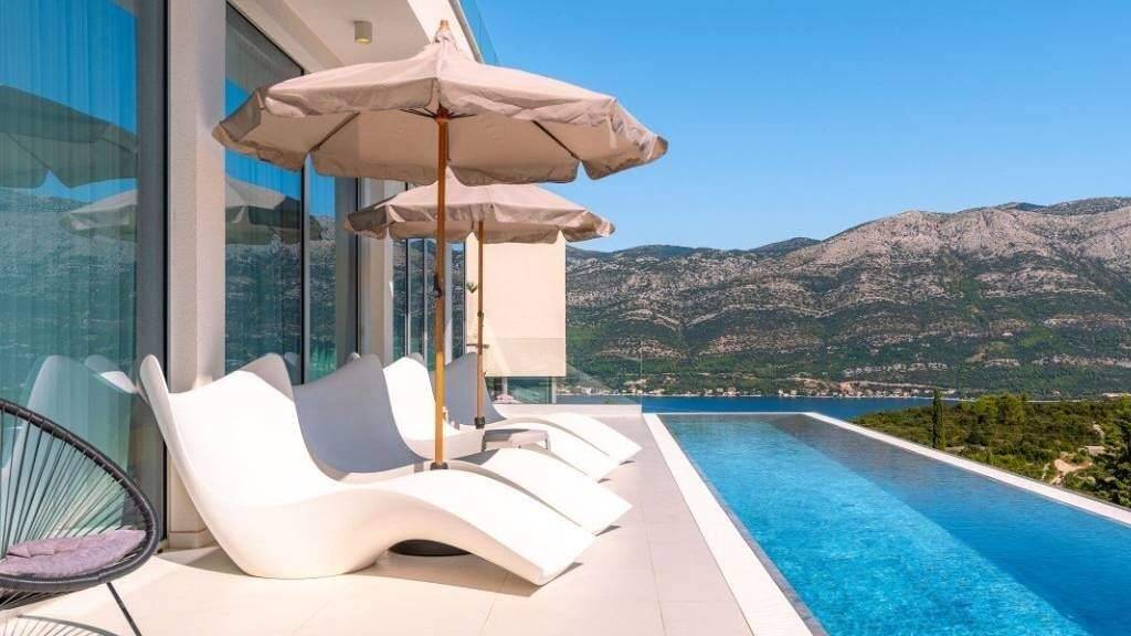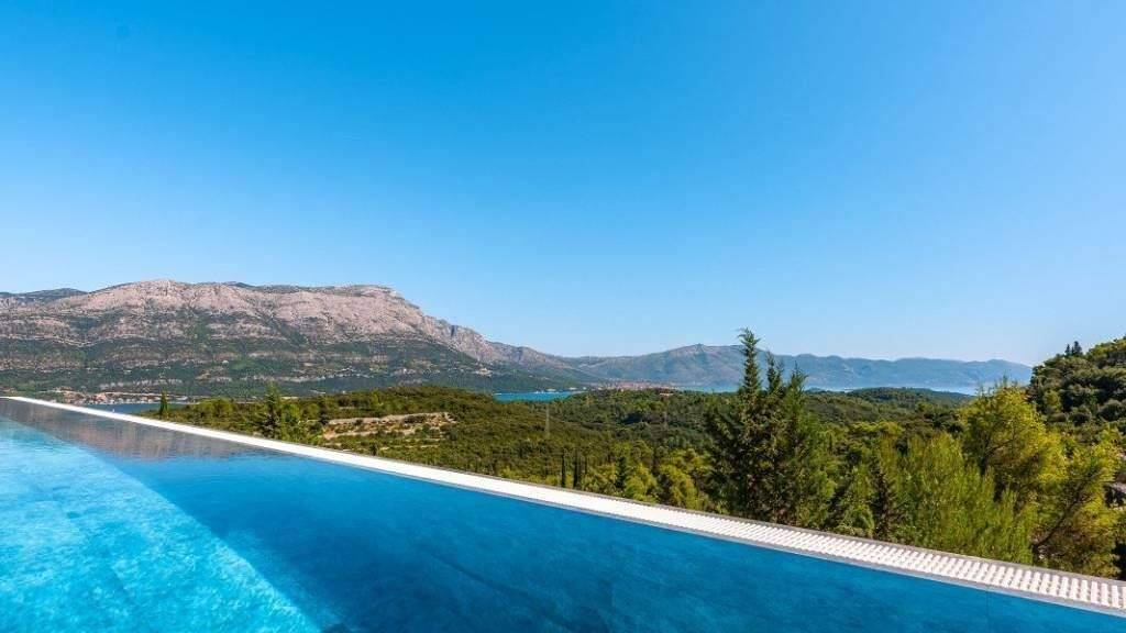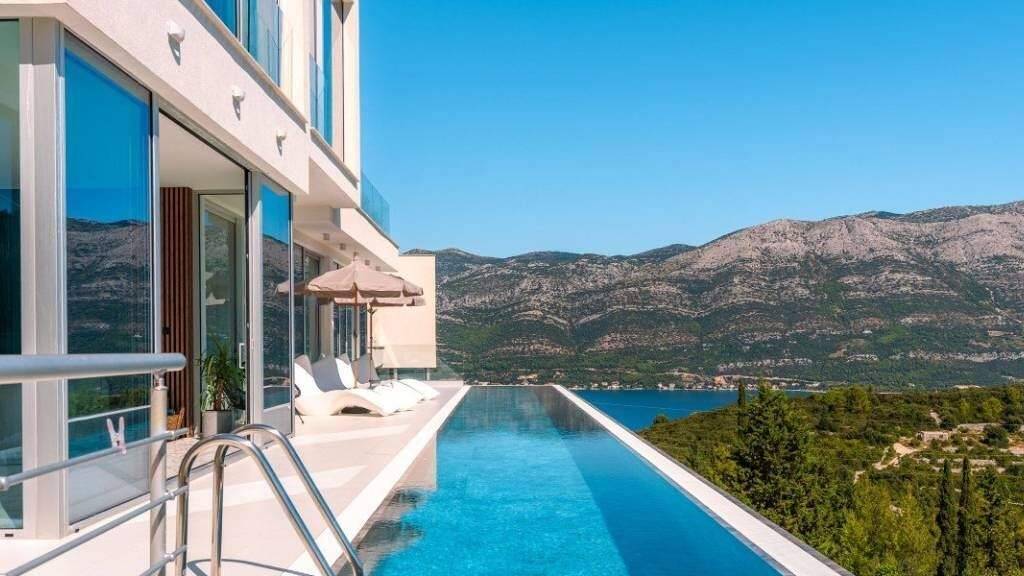 In ruhiger Lage nahe der Stadt Korcula befindet sich eine moderne Villa mit klaren Linien und einem raffinierten, minimalistischen Design im Innen- und Außenbereich. Das Anwesen bietet einen wunderschönen Panoramablick auf den Korcula-Kanal, die Halbinsel Peljesac, den Gipfel des Sveti Ilija, die Insel Badija und die grüne Umgebung und garantiert so ein Höchstmaß an Privatsphäre und einen angenehmen Aufenthalt.