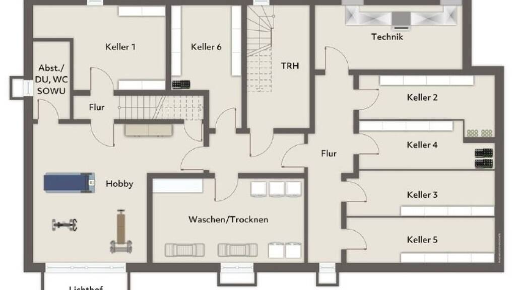 Im Untergeschoss des Hauses befinden sich Kellerräume für die einzelnen Wohnungen, ein Technikraum und eine gemeinschaftliche Waschküche.