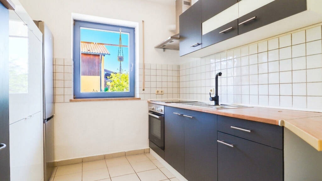 Herzstück der Wohnung ist das weitläufig geschnittene Wohnzimmer, das durch seine großen bodentiefen Fensterflächen mit Tageslicht durchflutet wird und eine einladende Wohnatmosphäre schafft. Von hier aus besteht ein direkter Zugang zu der Terrasse mit Blick ins Grüne. Diese bietet nicht nur Platz zum Entspannen im Freien, sondern verfügt zudem über zwei hübsch angelegte Beete. Diese sollen vom Mieter gepflegt werden, bieten aber auch noch Platz für eigene Gestaltung wie z. B. das Einsetzen von Kräutern oder Blühpflanzen. An das Wohnzimmer angrenzend befindet sich die Einbauküche mit ausreichend Verstaumöglichkeiten.
