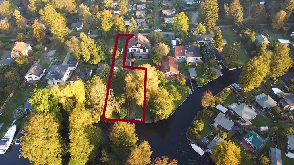 Das angebotene Grundstück befindet sich an einer ruhigen Anliegerstraße und wird als hinteres Teilgrundstück mit einer Wasserfront von rd. 14 m (Uferbefestigung aus Beton, Slipanlage vorhanden) am Kanal V gebildet. Die bereits durch einen Vermesser ermittelte Grundstücksgröße liegt bei rd. 880 m². Das Grundstück wird durch eine eigene Zufahrt mit einer komfortablen Breite von rd. 4 m erschlossen, wobei der Einfahrtsbereich auf eine Breite von 6 m und eine Tiefe von rd. 7 m gebildet wird. So wird zum einen eine bequeme Einfahrt gewährleistet, zum anderen dient die Einfahrt auch als weiterer Stellplatz.