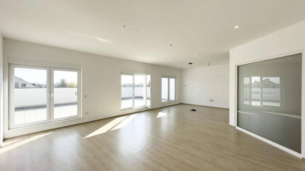 Der lichtdurchflutete Wohn-/Essbereich mit offener Küche lädt zum Entspannen und Genießen ein. Von hier aus haben Sie direkten Zugang zur beeindruckenden Dachterrasse mit über 78 qm Fläche in Süd-/West-Ausrichtung, perfekt, um die Sonne und den Blick in die Ferne zu genießen.