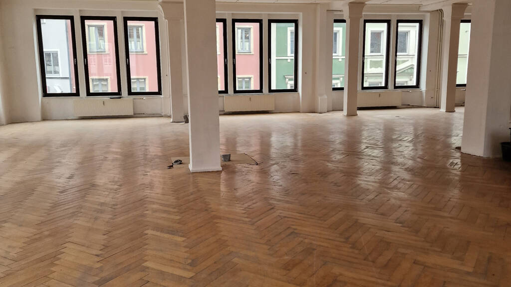 Der Zustand der Böden und Wände ist gebraucht und entspricht dem Zustand nach Auszug des betreibenden Einzelhandelsgeschäfts. Auf den gesamten Flächen ist ein historischer Fischgrätparkett verlegt. Dieser ist teilweise beschädigt, würde jedoch bei einer Anmietung noch vom Vermieter zu dessen Lasten instand gesetzt.