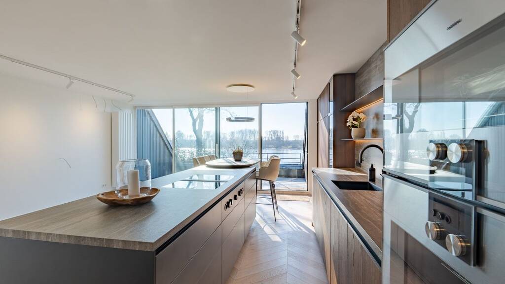 Küche OG: Edle Einbauküche von Molteni mit großer Kochinsel und E-Geräten von Gaggenau und Bora, die Arbeitsplatte besteht aus Keramik Inalco, die Küchenfronten sind in Stahl- und Furnieroptik, die Barhocker von Cattalan Italia OG: Garderobe und Ankleide von Molteni Designerlampen und Lichtdesign von Flos, Lodes, Occhio und Terzani (in der ganzen Wohnung)