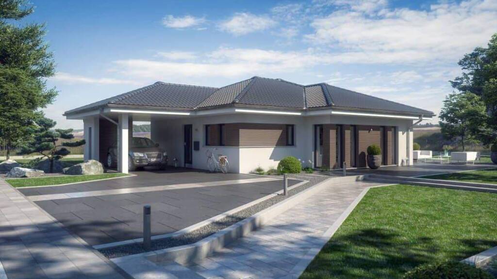 Bemerkenswert auch die architektonische Gestaltung der einzelnen Varianten: Da ist der Bungalow mit elegantem Dachüberstand, der die klassische Satteldacharchitektur zeitgemäß interpretiert. Der Walmdach-Bungalow besticht mit seiner eindrucksvoll vielgliedrigen Dachlandschaft. Und für anspruchsvolle Baufamilien, die Gefallen an einer klaren Linienführung finden, stellt die puristische Flachdachvariante einer zeitlosen Gestaltung auf Basis der Bauhaustradition dar.