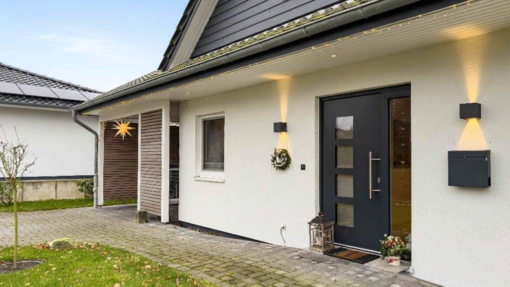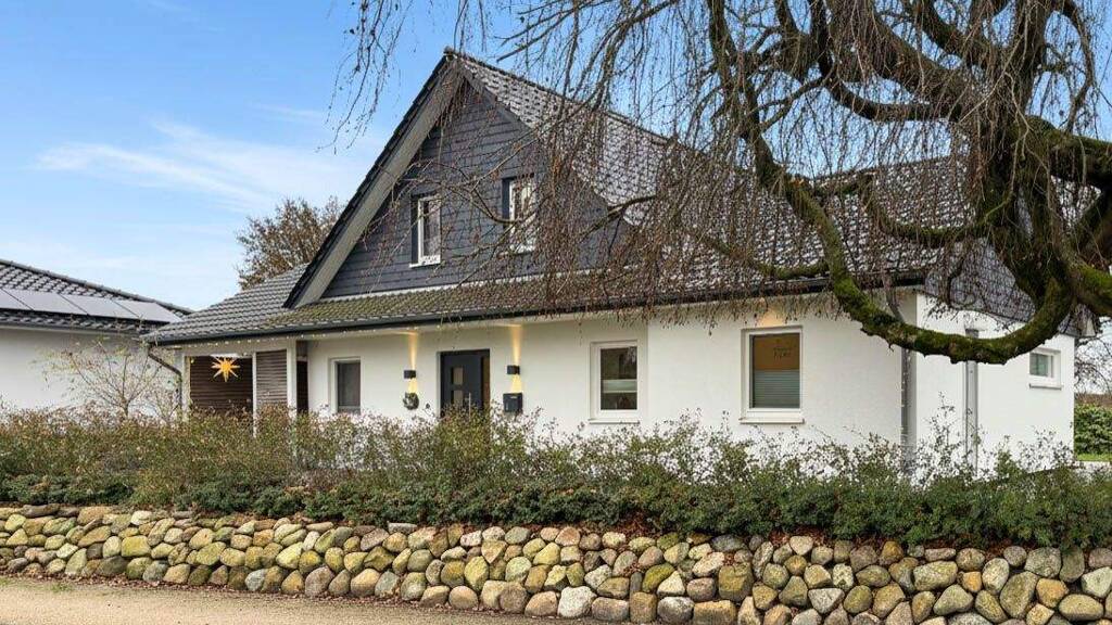 Erst im Jahr 2022 fertiggestellt, sucht dieses moderne Einfamilienhaus neue Eigentümer, die sich an einer Bestandsimmobilie in tadellosem Zustand erfreuen möchten. Das Haus wurde auf einem großzügigen Grundstück mit Südausrichtung und Blick ins Grüne in hochwertiger Holzständerbauweise errichtet und verfügt über viele Details, die das Wohnen komfortabel und zeitgemäß machen. Neben dem Haupteingang befindet sich im Carport ein Seiteneingang zum geräumigen Hauswirtschaftsraum mit Platz für sämtliche Haushaltsgeräte. Von hier aus gelangt man direkt in die helle, voll ausgestattete Küche mit Essbereich und Zugang zum Garten. Das angrenzende Wohnzimmer mit Zugang zur Südterrasse verfügt über einen Kamin. Durch eine Flügeltür betritt man den Flur mit Aufgang in das Obergeschoss und Arbeitsbereich. Im Erdgeschoss befinden sich weiterhin ein Schlafzimmer und ein Duschbad. Auch diese beiden Räume haben einen direkten Austritt in den Garten. Im Obergeschoss liegt ein weiteres Schlafzimmer mit Wannenbad en Suit und Zugang zur Loggia in Südausrichtung. Zwei geräumige und begehbare Abseiten bieten viel Stauraum. Das gesamte Haus wird durch eine Fußbodenheizung erwärmt. Das Lichtsystem lässt sich bei Bedarf teilweise auch im Haus auf einen Bewegungsmelder umstellen. Im Carport mit angrenzendem Schuppen befindet sich die Luftwärmepumpe. Zwei weitere befestigte Parkmöglichkeiten liegen vor dem Carport. Der Garten mit einem Gartenhäuschen ist durch seine optimale Südausrichtung den ganzen Tag sonnenbeschienen. Die grüne Einfriedung und die Angrenzung an eine Weide sorgen für Privatsphäre. Sehr gern präsentieren wir Ihnen dieses tolle neuwertige Haus bei einer Besichtigung vor Ort. Sprechen Sie uns gern an!