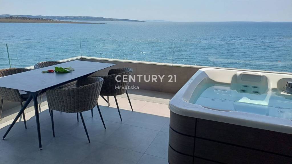 Ovaj savrseni stan ima dvije spavace sobe, prostrani open space dnevni boravak sa kuhinjom i blagovaonom te veliku terasu od 17,50 m2 sa neometanim, otvorenim pogledom na more. Zgrada je novogradnja, smjestena u mirnoj ulici, a stan se nalazi na prvom katu. Stan je potpuno opremljen i namjesten modernim namjestajem i aparatima, uz jacuzzi na terasi.