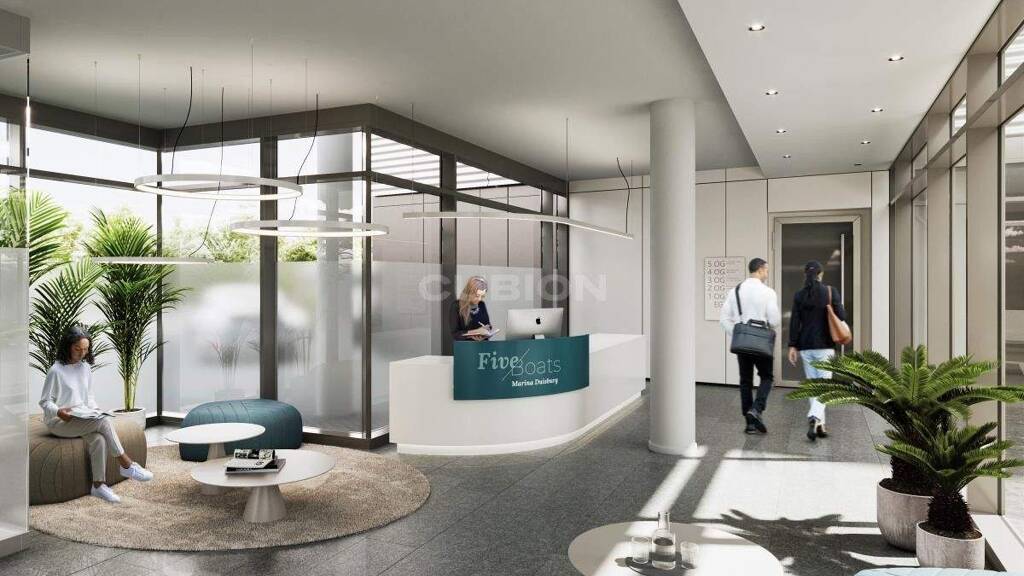 Erstklassige Ausstattung und variable Raumnutzung. Dass Ästhetik nicht im Widerspruch zu Qualität und Funktionalität steht, demonstriert FiveBoats eindrucksvoll. So verfügt das Objekt über eine Bauteilkühlung. Das System leitet im Sommer kaltes Wasser durch die Decken und reguliert so die Temperatur variabel und individuell auf ein angenehmes Maß. Die Büros sind höchst flexibel als Großraum-, Einzel oder Kombibüro nutzbar.