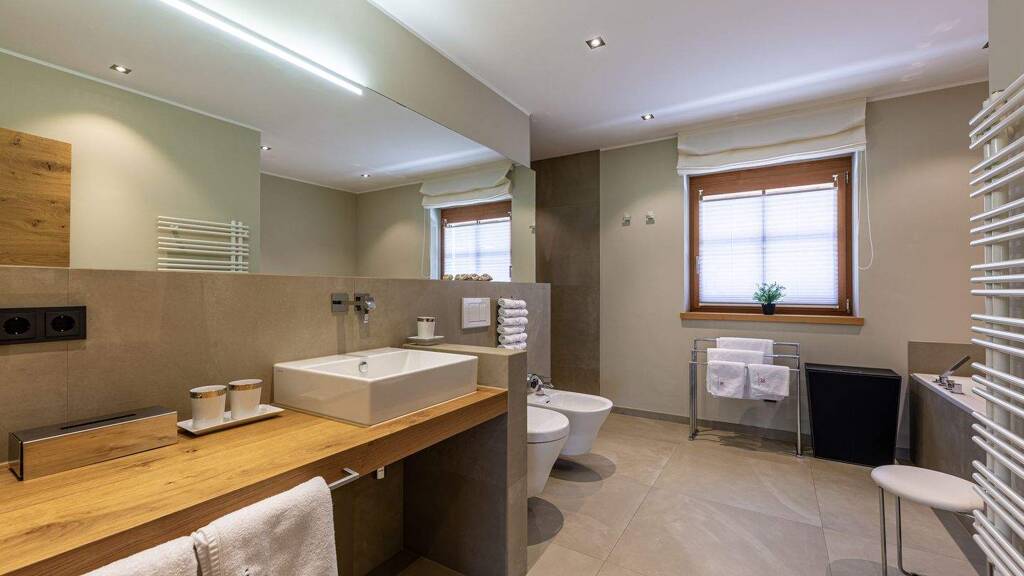 Die Wohnung befindet sich in einer leicht erhöhten Hanglage und bietet dadurch einen atemberaubenden Panoramablick auf das majestätische Massiv des Wilden Kaisers. Der lichtdurchflutete Wohn- und Essbereich mit edler Einbauküche und offenem Kamin schafft eine behagliche Atmosphäre und lädt zum Verweilen ein.